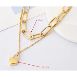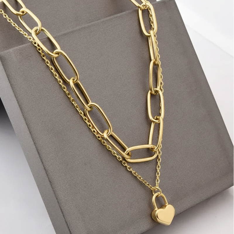 Adoptez le look superposé instantané avec ce collier double, combinant chaîne à maillons audacieux et pendentif cadenas cœur fin en acier inoxydable.