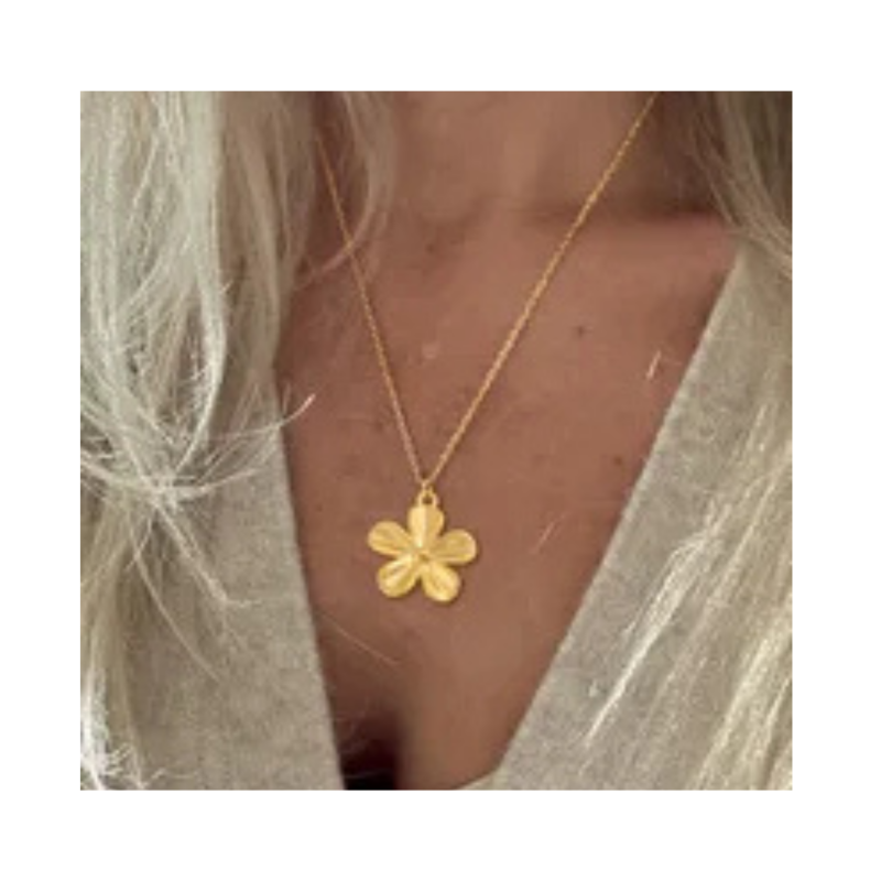 Le Collier Pendentif Fleur XXL est la pièce maîtresse idéale pour compléter votre look. Ce collier présente un grand pendentif fleur texturé (d'environ 2,8 cm) au design moderne et sculptural, parfaitement assorti au bracelet et aux bagues de la collection.
